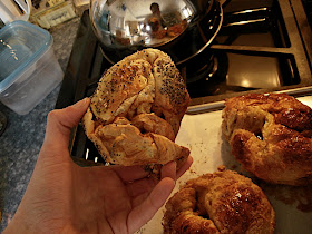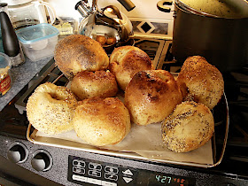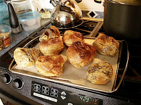 verdict: less than stellar. In fact, worst bagel ever: very chewy (like silly putty!), little taste, and the appearance was a little bit disgusting. I think I'm doing something wrong when making the dough. I can't get it smooth like the book says it should be and I kneaded extra (after two nights of failed attempts) this time! I didn't have a lot of hope for these after having so much trouble with the dough, but the pictures are kinda cool. I wish I'd taken a picture before they went in the oven.