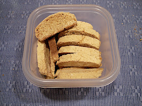 verdict: quite good. Biscotti is supposed to have all the moisture baked out of them and therefore they have a quite long shelf life. However, having all the moisture baked out of them means they are super crunchy/dry. Remind me a bit of the texture of a dog biscuit... but would a dog biscuit taste so good when dunked in a convenient cup of tea? I don't think so. The tea (or coffee if one is so inclined) re-hydrated it perfectly to be more a melt in your mouth sort of thing.